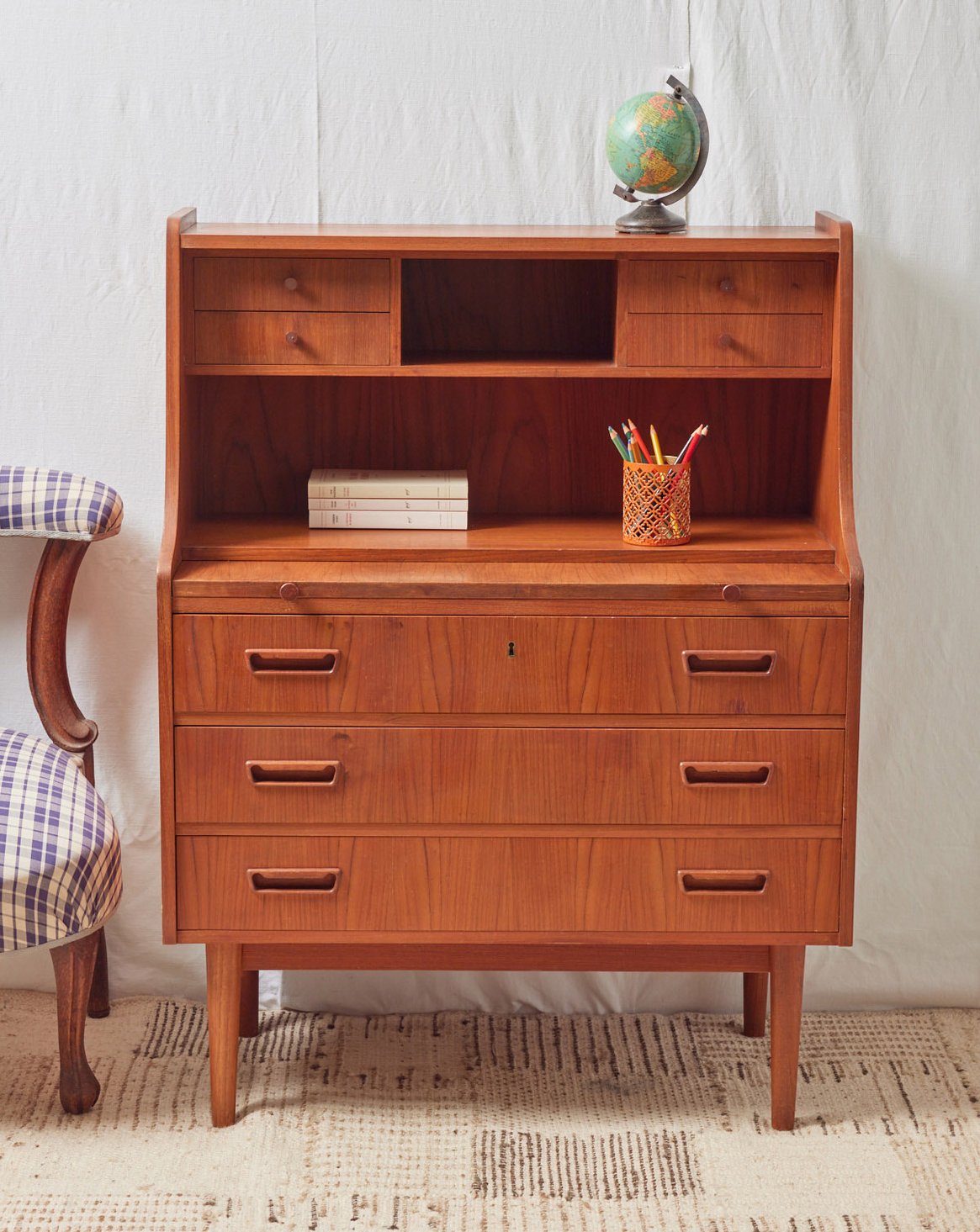Adoptez ce secrétaire scandinave, fabriqué au Danemark et pensé pour conjuguer design épuré et fonctionnalité. Son grand plateau dépliant offre un véritable poste de travail, tandis que les trois grands tiroirs et les quatre petits garantissent un rangement organisé pour papiers, courriers et fournitures. Les poignées moulées en teck ajoutent une chaleur naturelle et une finition raffinée qui mettent en valeur les proportions équilibrées du meuble. Idéal dans un salon ou un bureau pour instaurer une ambiance chaleureuse et minimaliste.