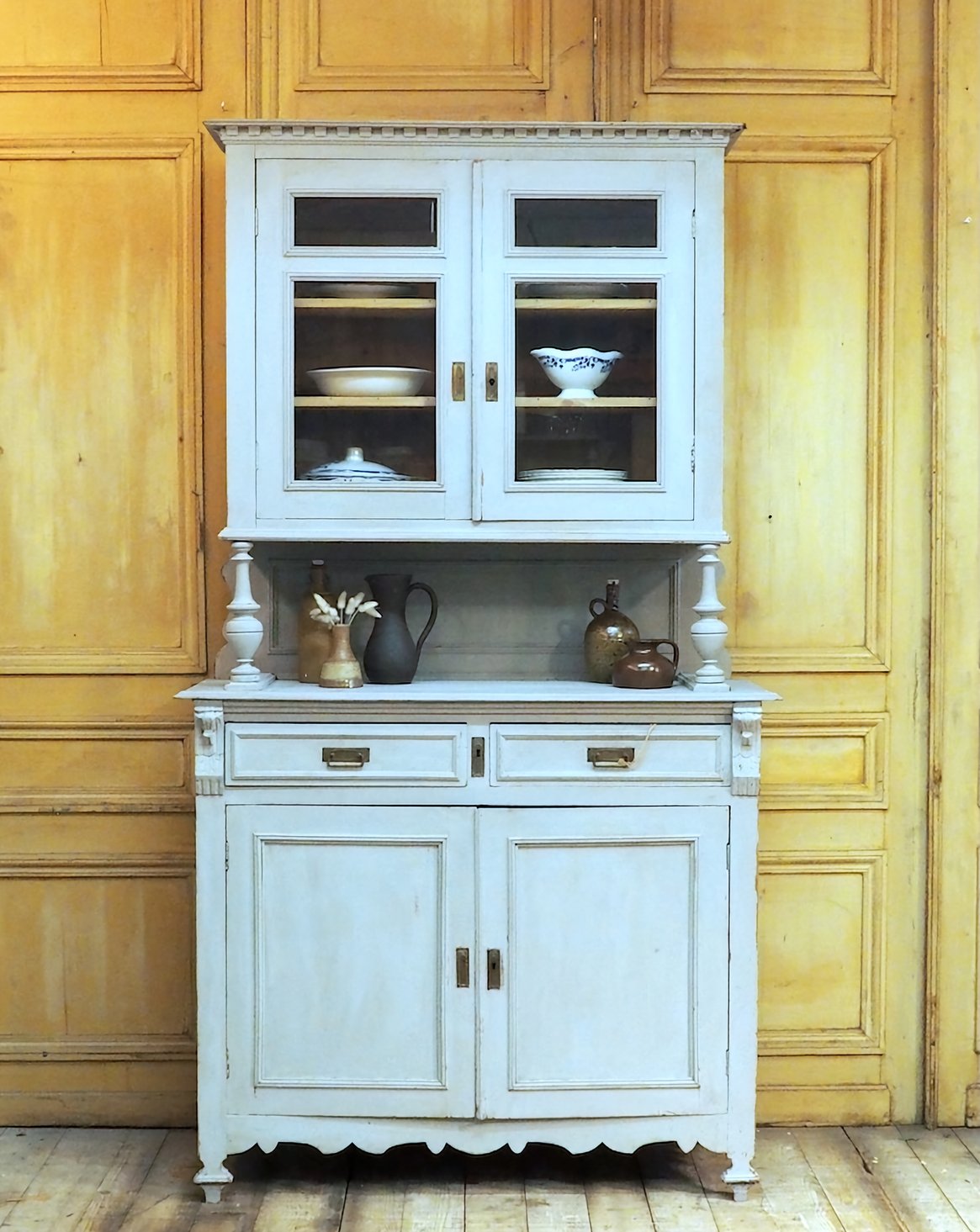Découvrez ce vaisselier double corps en chêne des années 1960, rehaussé d'une peinture patinée qui lui confère une élégante allure vieillie. Ses quatre portes et deux tiroirs multiplient les possibilités de rangement, tandis que les étagères aux hauteurs variées accueillent vaisselle, verrerie et pièces plus volumineuses ; serrure d'origine avec clé incluse. Sa silhouette généreuse structure une cuisine ou une salle à manger dans une ambiance chaleureuse et authentique.