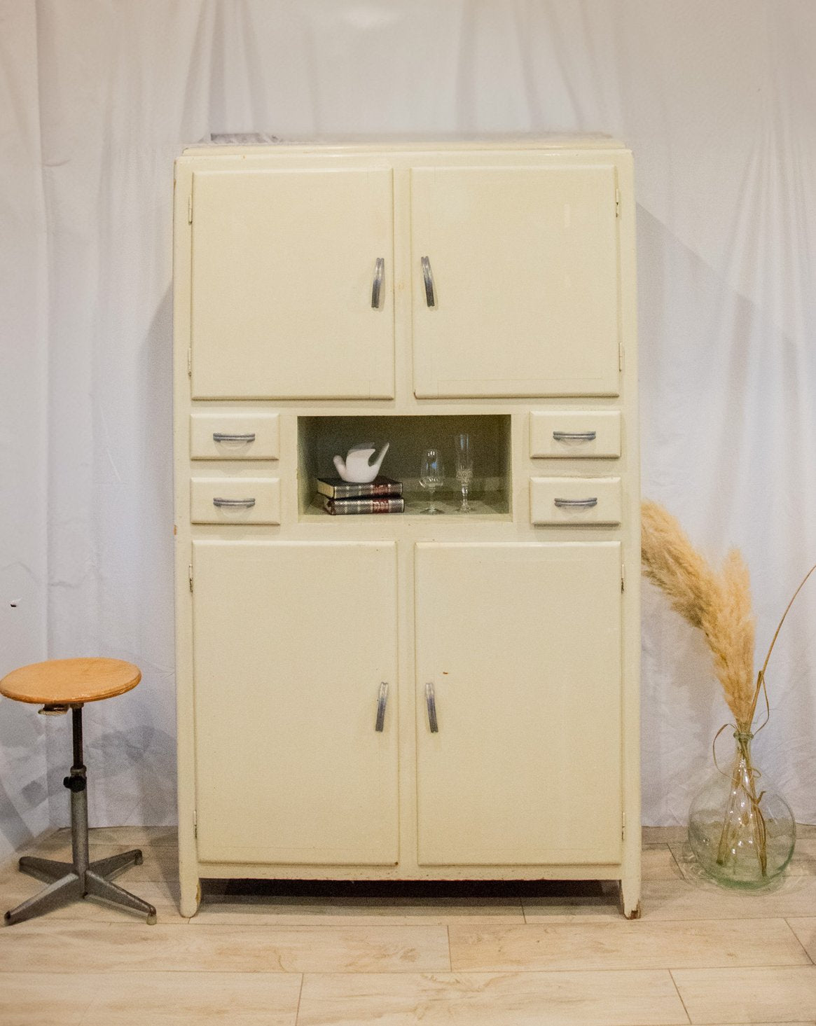 Adoptez ce mado gris-beige, authentique et compact, qui impose une allure discrète grâce à ses poignées en biais et sa peinture patinée. Pensé pour la pratique, il propose deux placards, quatre tiroirs — dont un spécialement conçu pour les couverts — étagères intérieures réglables, crochets intégrés et rangements divers, tandis que les fonds et étagères sont protégés par un film plastique. Son format contenu convient à une cuisine, une buanderie ou une entrée où il installe une ambiance chaleureuse et organisée. Plusieurs éclats de peinture, et diverses traces du temps et un pied avant droit abîmé mais stable, tous témoins de son caractère unique et authentique.
