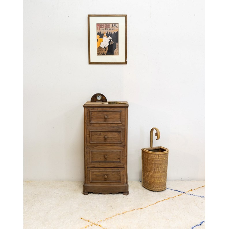 Adoptez ce chiffonnier en noyer aux lignes chaleureuses, où le veinage du bois met en valeur une élégance certaine. Quatre tiroirs offrent un rangement modulable, idéal pour une chambre, une entrée ou pour structurer un petit espace grâce à ses proportions équilibrées. Sa finition naturelle crée une atmosphère douce et intemporelle, entre modernité sobre et charme d'atelier. Quelques traces du temps présentes qui racontent son histoire.