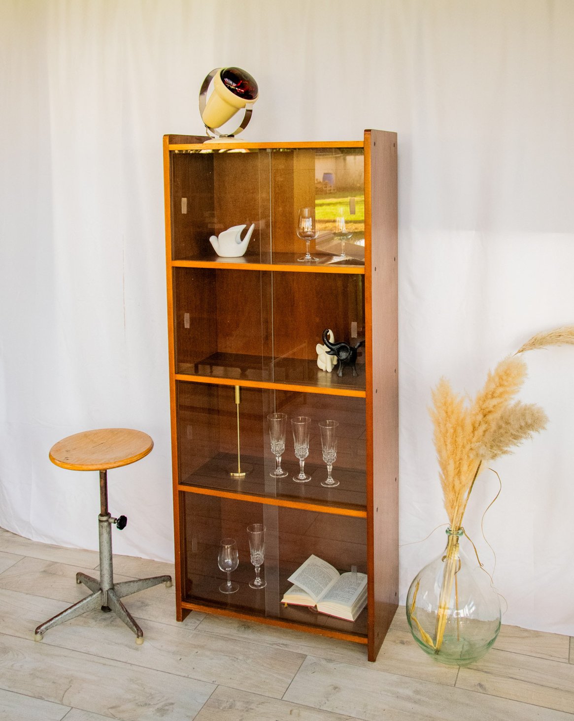 Découvrez cette vitrine à quatre niveaux, dotée de huit portes en verre qui offrent une présentation raffinée pour vaisselle, collections ou objets décoratifs. Sa silhouette sobre et modulable apporte une élégance discrète à la cuisine, au salon ou à un atelier, laissant la lumière circuler pour mettre en valeur chaque pièce. Les étagères généreuses et la composition en verre renforcent son rôle de meuble d'exposition pratique et aérien. Très légères micro rayures sur le verre et traces du temps sur sa structure bois, renforçant son caractère unique.