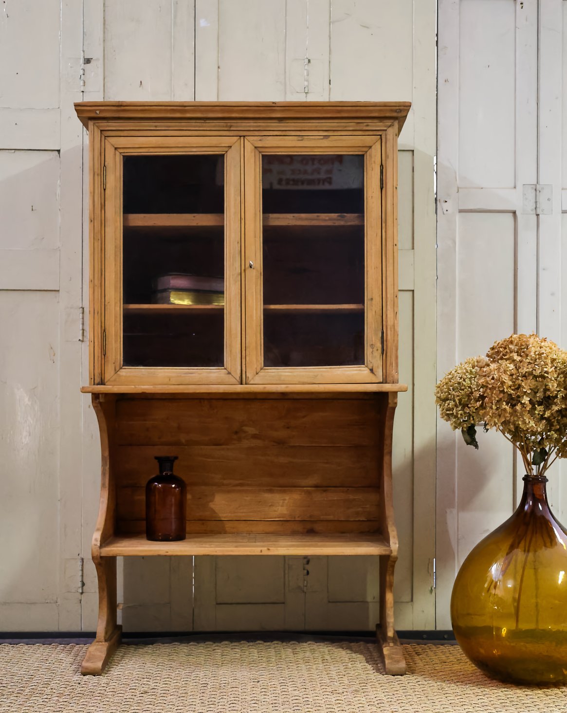 Invitez cet ancien meuble à épices en pin, doté d'une vitrine en verre, dans votre cuisine pour organiser et sublimer vos condiments. Son format haut et compact dévoile sur sa partie supérieure trente-six petits casiers pensés pour accueillir épices et petits flacons, tandis que les trois étagères offrent un rangement modulable pour bocaux et accessoires. Le bois de pin diffuse une chaleur naturelle et un style sobre, parfait pour composer une ambiance atelier ou campagne chic. Ce présentoir fera également merveille dans une salle de bain pour y disposer les différents produits de beauté. Usures présentes.