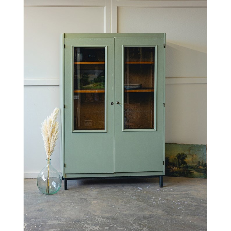 Découvrez cette ancienne armoire d'école vitrée, subtilement repeinte en vert grisé clair, qui mêle mémoire et sobriété contemporaine. Son vantail verrouillable et ses portes vitrées laissent voir quatre étagères modulables offrant une capacité de rangement généreuse, idéale comme bibliothèque ou meuble de rangement dans un salon ou un bureau. Les pieds en métal noir renforcent son caractère industriel et apportent une belle assise visuelle. Quelques marques d'usage qui font son authenticité.