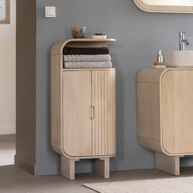 Chiffonnier en bois de manguier avec 1 porte et 1 niche ouverte. Design arrondi et rainuré, idéal pour une chambre ou une entrée. Dimensions : L45 x P35 x H101,5 cm.