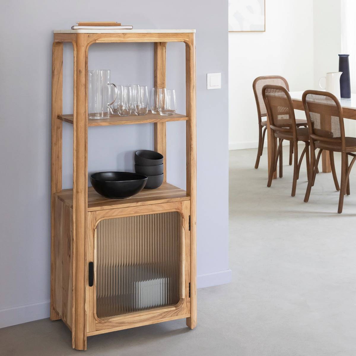 Petit meuble en bois d'acacia – collection Emyr. Compact et fonctionnel, il offre deux étagères ouvertes et un rangement fermé. Idéal comme colonne ou console d'appoint dans toutes les pièces. Design épuré et naturel.