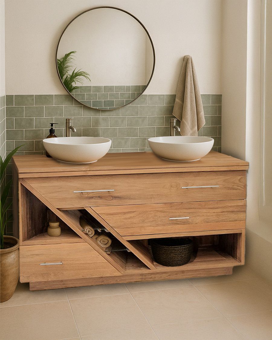 Ce meuble de salle de bain en teck massif apportera une touche d'originalité à votre salle de bain. Avec ses lignes géométriques audacieuses et sa structure asymétrique, ce meuble sous vasque se distingue par un design unique, alliant modernité et chaleur naturelle. Fabriqué entièrement en bois de teck massif, il incarne la robustesse et la durabilité, tout en offrant une résistance naturelle à l'humidité.