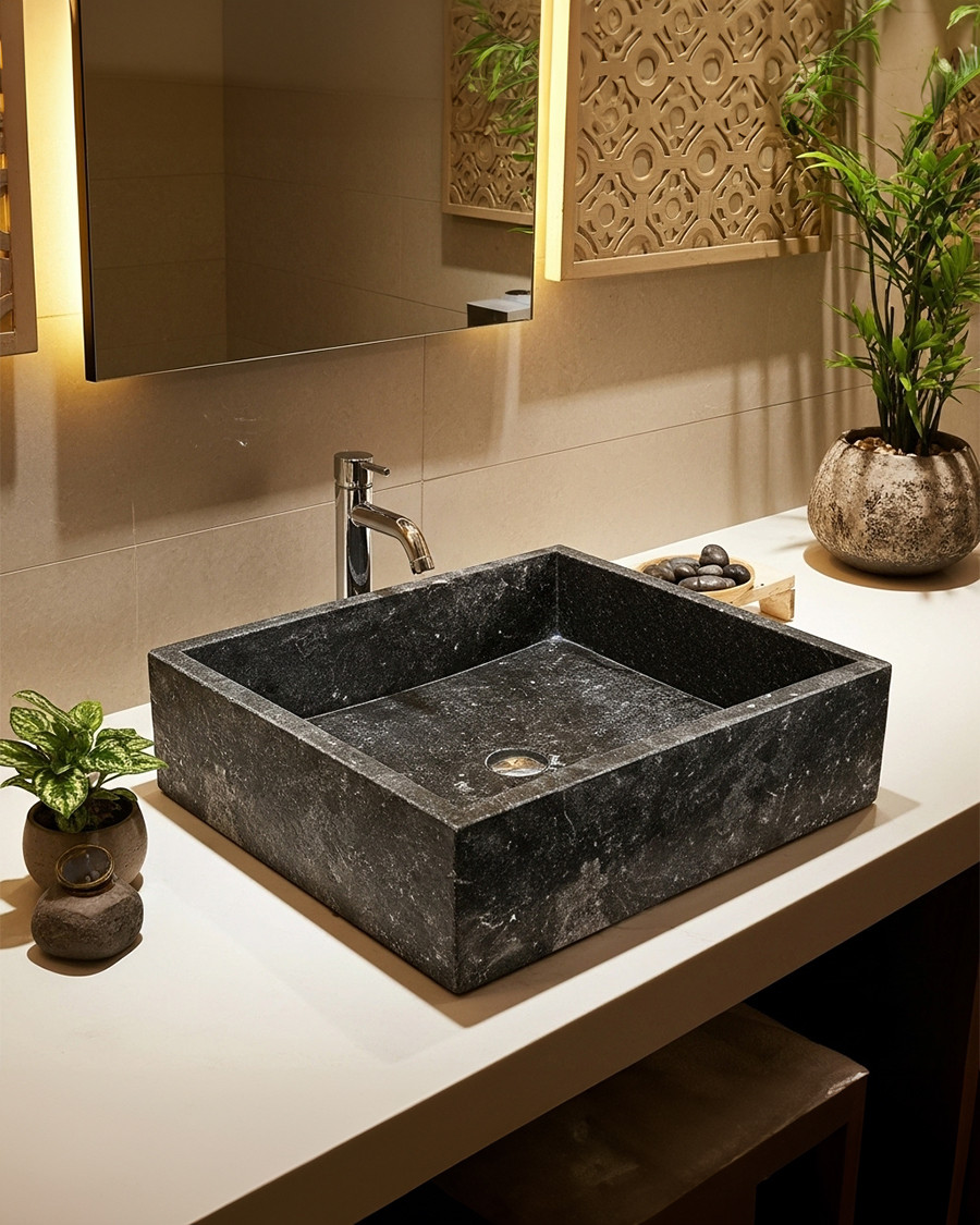 Découvrez le charme sophistiqué de la vasque à poser rectangle Malka en marbre terrazzo premium noir , une pièce d'exception qui sublimera votre salle de bain. Son design rectangulaire aux lignes épurées apporte une touche de modernité et d'élégance à votre salle de bain.