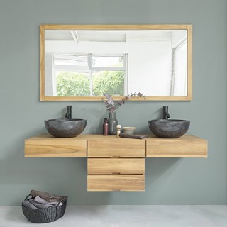 Design et moderne, ce meuble de salle de bain en teck est comme suspendu, en lévitation. La robustesse du teck qui le compose vient contre-balancer la légèreté de ses lignes. Équipé de 3 tiroirs, vous permettant un rangement pratique et accessible, ce meuble sera parfait surplombé par un grand miroir en teck qui viendra majestueusement parfaire l'ensemble. CARACTERISTIQUES : - Dimensions et Poids : L160 x P55 x H45 cm / 45 kg. - Poids maximum supporté : 60 kg - Matériau : Teck Brut Massif - Traitement de surface anti humidité - Montage : Livré monté.