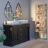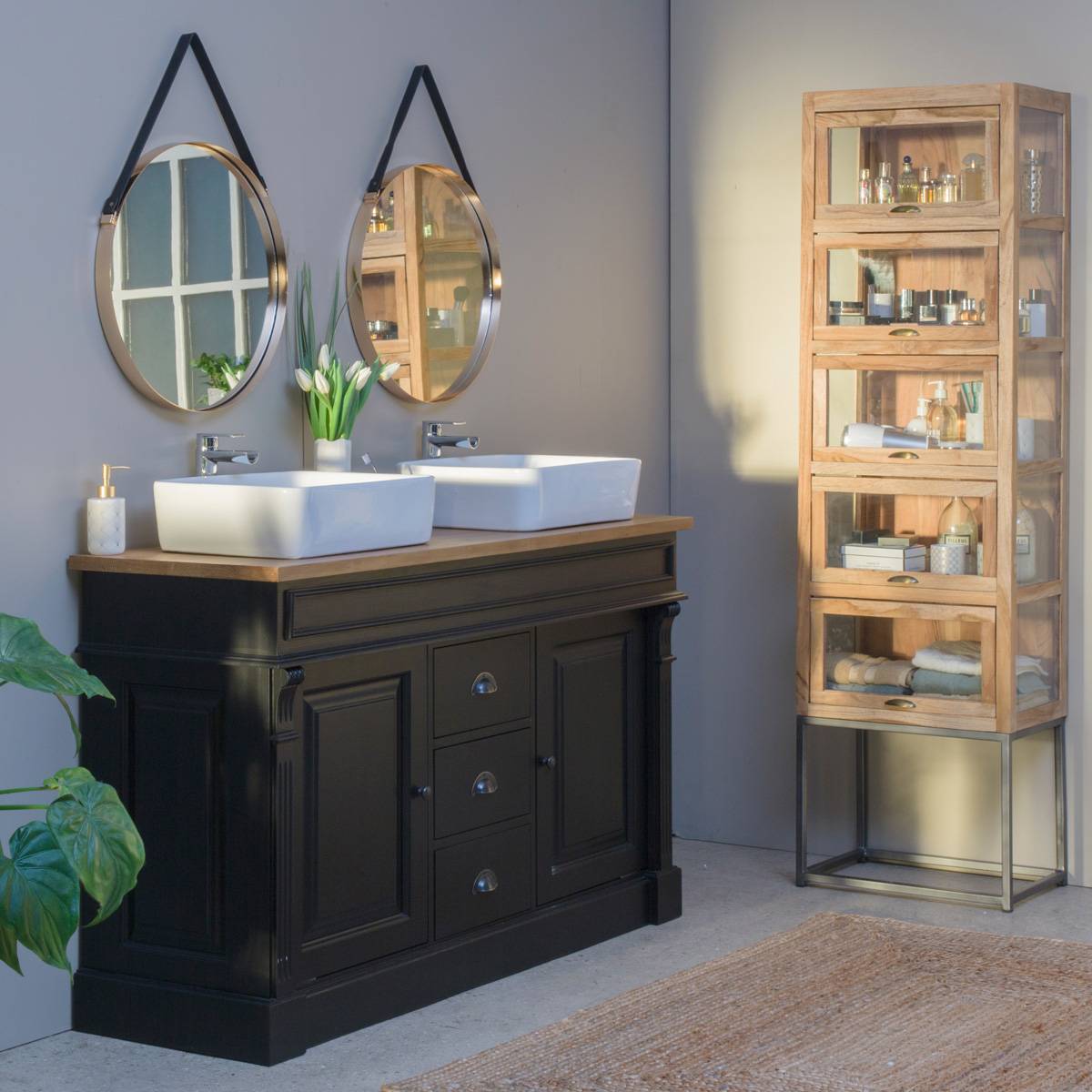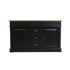 Meuble de salle de bain en bois massif noir ciré, alliant style traditionnel et moderne. Avec 2 portes, 3 tiroirs et un plateau non percé, il offre un rangement optimal. Vendu sans vasques. Pas de vide sanitaire.