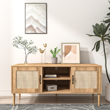 Ce meuble TV allie élégance et fonctionnalité avec son design en bois clair et ses portes effet cannage. Parfait pour un intérieur contemporain ou scandinave, ce meuble offre deux portes pour un rangement discret et deux niches pratiques avec passe-fils, idéales pour vos appareils multimédias. Polyvalent et esthétique, ce meuble apporte une touche naturelle et raffinée à votre espace de vie.