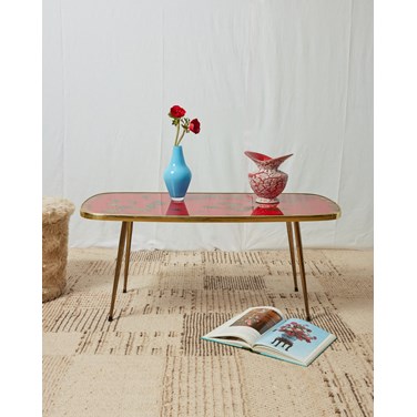 Apportez une touche singulière à votre salon avec cette table basse au plateau de verre, fond rouge et motifs de poissons originaux qui captent le regard et animent l'espace. Les pieds en laiton apportent une note vintage élégante et structurent des proportions pensées pour un usage convivial autour du canapé. Le mariage du verre coloré et du métal installe une atmosphère chaleureuse et graphique, idéale pour une décoration inspirée et racontée. Petit manque sur la tranche et interruption du liseré en laiton.