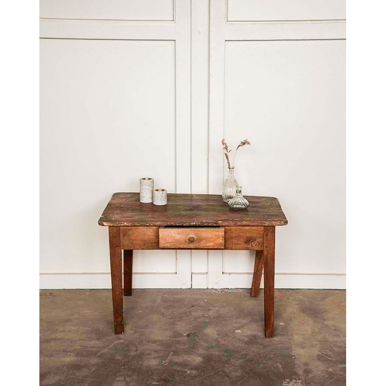 Découvrez cette table basse de ferme au tempérament authentique, en bois à plateau en lames qui dévoile une patine de caractère. Son format généreux offre une surface idéale pour livres et moments partagés, et un tiroir discret apporte un rangement pratique. Le piètement, robuste dans l'ensemble, présente un pied arrière droit courbé sans nuire à la stabilité. On relève un léger jeu sur le plateau, stable néanmoins, qui atteste de son histoire. Légères traces du temps qui participent à son charme.