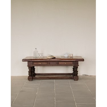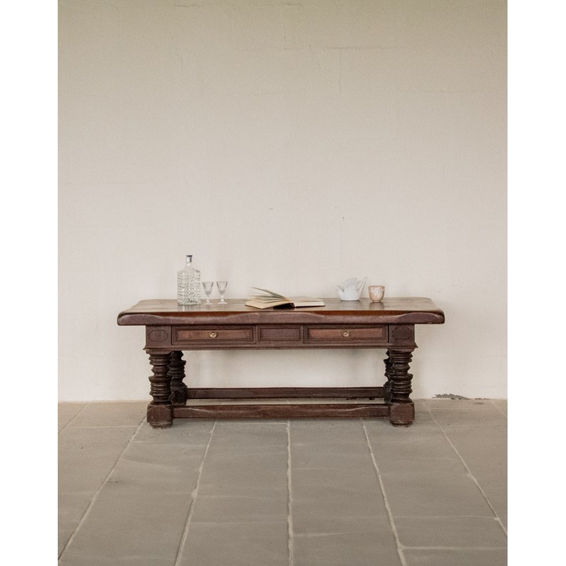 Sublimez votre intérieur avec cette table basse de campagne en chêne massif, teintée d'une patine sombre qui souligne la richesse du bois et les faces sculptées. Ses deux tiroirs munis de boutons en laiton offrent un rangement discret pour télécommandes et revues, tandis que les pieds tournés apportent une silhouette authentique et stable aux proportions généreuses. Parfaite pour instaurer une ambiance chaleureuse et conviviale, elle s'intègre aussi bien dans un salon rustique que dans un intérieur contemporain, apportant caractère et élégance.