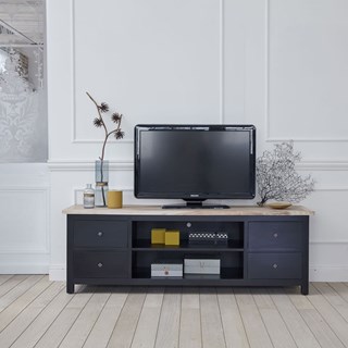 Mettez votre TV et vos installations hifi en valeur sur le meuble TV LONDRES, alliant noblesse du bois et finition de qualité. Fabriqué en acajou teinté noir et équipé d'un épais plateau de teck à la finition patinée, ce meuble TV est pourvu de 2 très larges niches et de 4 tiroirs de rangement, vous permettant ainsi de caser tous les éléments et accessoires techniques et d'éviter fils et câbles disgracieux. Caractéristiques : Matière : Acajou et teck - Couleur : Noir et teck naturel - Hauteur : 60 cm - Longueur : 180 cm - Profondeur : 50 cm - Poids : 48 kg - Garantie : 5 ans - Montage : Livré monté. Les + : 4 tiroirs – 2 niches.