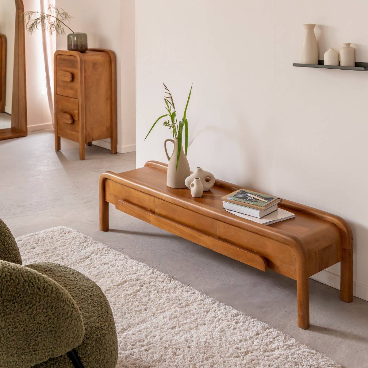 Meuble TV en bois de manguier – collection Féodor. 3 tiroirs, structure arrondie et design organique. Un meuble pratique et élégant pour un salon naturel et contemporain.