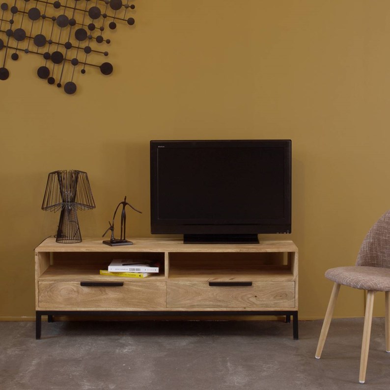 C'est en alliant subtilement le bois et le métal que ce meuble TV est totalement dans la tendance actuelle. A la fois simple et épuré, c'est un meuble passe-partout qui s'intégrera dans tous types de décoration. Il vous proposera des solutions de rangement déjà très organisées grâce à ses 2 niches distinctes et ses 2 larges tiroirs. Conçu à partir du bois de manguier, on aime ce matériau chaud qui réchauffe nos intérieurs grâce à ses nuances claires. Le piétement, réalisé entièrement en métal noir, est très bien dosé. Ni trop grand, ni trop petit, ce meuble vous propose des dimensions parfaites pour meubler un appart cosy ou une maison conviviale. Ce meuble TV fait partie de la collection PIA : Vous pourrez aisément le combiner avec la table basse ou buffet assortis, et profiter de tarifs avantageux sur la livraison.