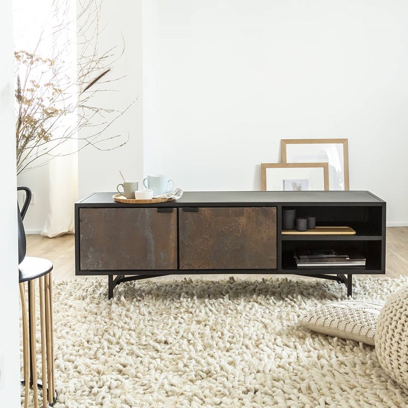 Conçu à partir de matériaux de qualité, ce meuble TV industriel possède de belles nuances qui font de lui un meuble original. Vous retrouverez une structure en MDF teinté noir mat, au niveau du plateau, du dos et des côtés du meuble. Afin d'assurer une robustesse sans égale, le piètement et le contour du meuble sont constitués de métal. . Sur sa droite, vous retrouverez 2 portes battantes et aimantées derrière lesquelles se cache une étagère. Cela vous sera très utile si vous avez besoin d'un espace de rangement supplémentaire pour disposer votre surplus de vaisselle. Sur la gauche, on retrouve 2 niches qui vous permettront d'exposer votre box ou vos consoles.
