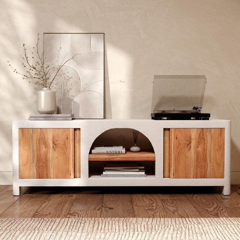 Meuble tv en plâtre blanc cassé et bois d'acacia 145 cm - fira