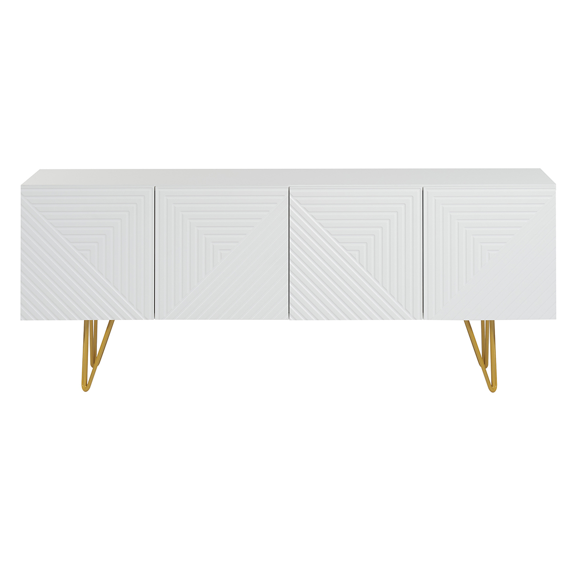 Le meuble TV OZEN est un véritable concentré d'élégance. Son caisson blanc immaculé s'habille de superbes gravures graphique s, hypnotiques. Il repose sur des pieds en épingle en métal doré , de quoi donner un côté ultra aérien et tendance à l'ensemble. Moderne et design , ce meuble TV blanc et doré apportera une belle touche d'éclat du salon ! Au sein d'un séjour contemporain, il formera la combinaison parfaite accompagné du buffet assorti .