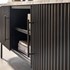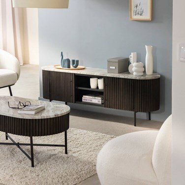 Meuble TV Orlando en métal aux reflets bronze, avec plateau en marbre. Pratique grâce à ses rangements fermés et sa niche centrale, c'est une pièce forte qui apporte une belle présence dans le salon.