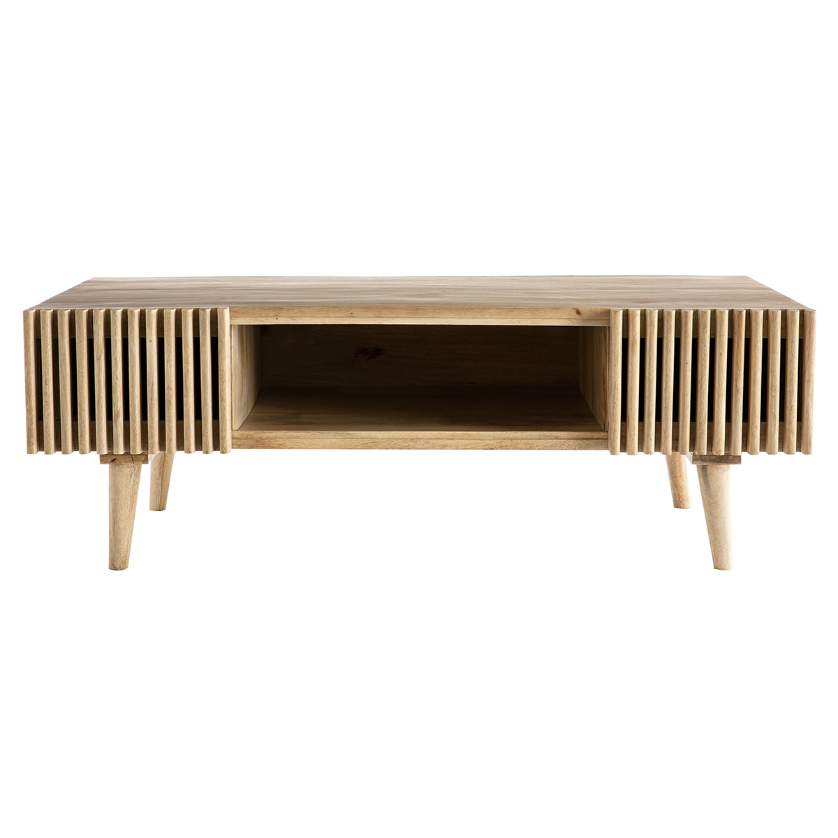 Du bois massif , une forme minimaliste qui rappelle le style scandinave, une touche de fantaisie subtile... cette table basse rectangulaire possède toutes les qualités des meubles dans l'esprit scandicraft. Conçue en manguier , un bois aux tons chauds et aux stries caractéristiques, elle offre un rendu chaleureux. Son piètement haut et ses portes coulissantes ajourées lui donnent un style léger et original.