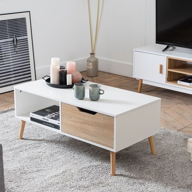 De style scandinave, cette table basse de salon est aussi fonctionnelle que design. Son apparence, sobre et esthétique, apporte de la luminosité à votre intérieur et pourra le faire paraître plus grand. Facile à monter, cette petite table de salon vous ravira également pour son côté pratique. En effet, elle est constituée d'un grand tiroir de rangement, dans lequel vous pourrez entreposer vos magazines, vos sous-verres ou encore vos télécommandes. Un deuxième caisson ouvert permet également de disposer d'un espace de décoration, afin de personnaliser votre table basse selon vos goûts. De matière composite, le plateau est facile d'entretien et saura résister au temps.
