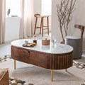 La table basse Sienne de chez Made in Meubles, incarne l'élégance contemporaine avec sa combinaison de matériaux de qualité et de design raffiné. Dotée d'une forme arrondie, elle offre une esthétique fluide et harmonieuse qui attire le regard. Son plateau en marbre ajoute une touche de luxe et de sophistication, tandis que le bois de manguier foncé apporte chaleur et caractère à la pièce. Les pieds en métal doré complètent le look avec une touche d'éclat subtil.Avec des dimensions de 46,5 cm de hauteur, 120 cm de largeur et 60 cm de profondeur, la table basse Sienne offre une surface généreuse pour accueillir des objets décoratifs.