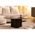 Sous des lignes fluides : fonctionnalité et robustesse vont de pair ! Élément central dans un séjour, formée par un piètement base trois cylindres et un large plateau ovale (L79 x L61 x E1.8 cm) en panneaux de fibres de bois placage chêne teinté , cette table basse noire rassemblera famille et amis le temps d'un apéritif festif, d'un goûter gourmand ou encore d'un plateau télé pour ne rien manquer de votre émission préférée !