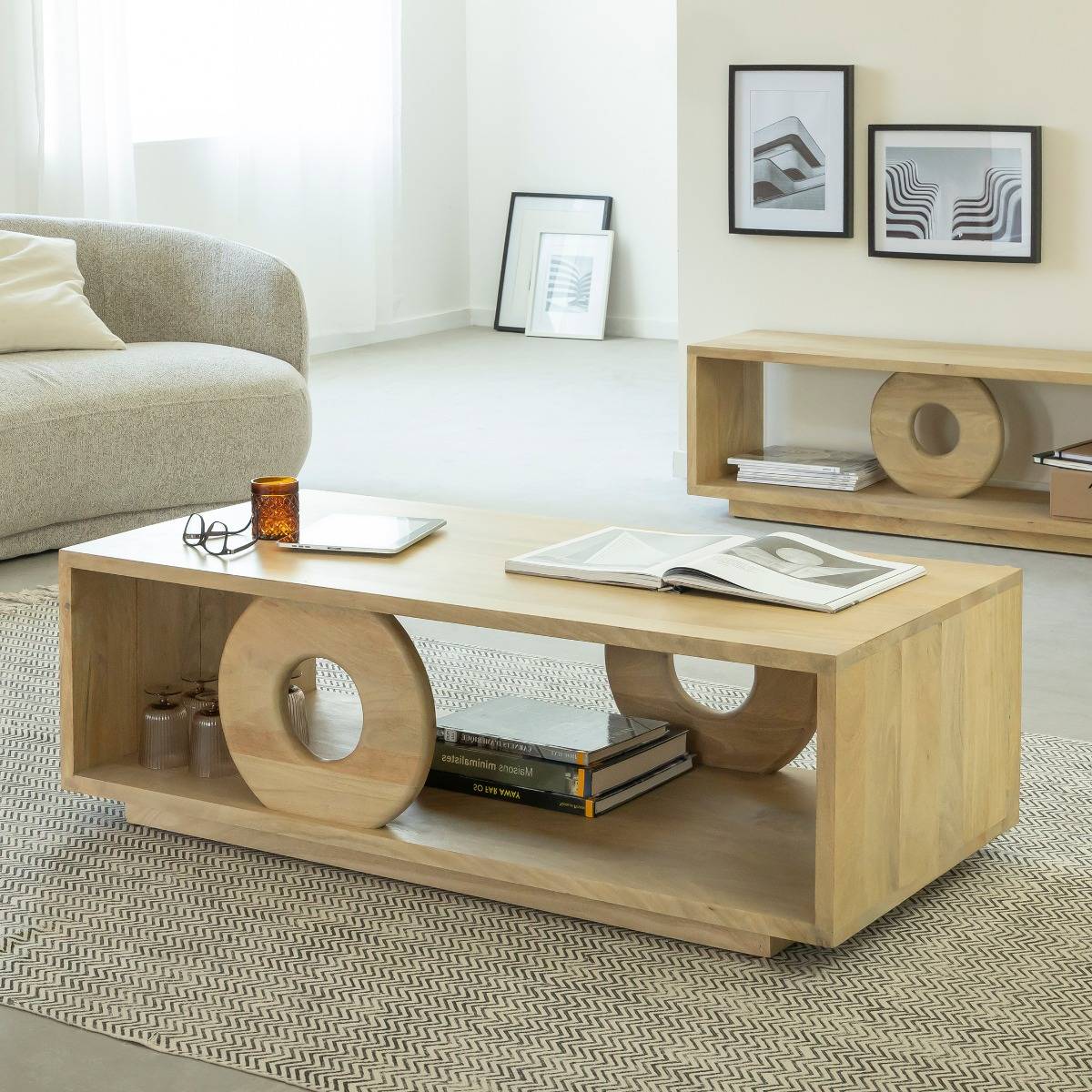 Table basse en manguier massif au design sculptural. Deux formes circulaires creusées au centre, style arty et contemporain. Pièce forte pour salon design.