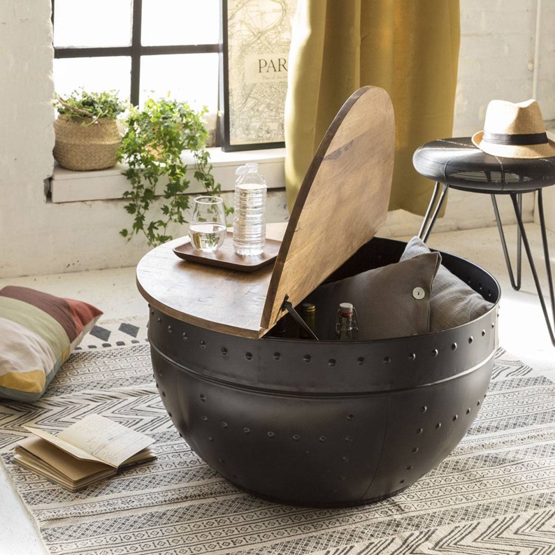 Avis aux amateurs du mobilier original, vous allez vous retrouver à travers cette table basse ! Elle est l'originalité incarnée ! Conçue en métal noir , elle a l'allure d'un bol quand on la regarde de loin. En s'approchant, on découvre que son plateau loge un espace de rangement très appréciable, on aperçoit l'effet clouté révélateur de la tendance industrielle ainsi que les nuances vives et lumineuses de son bois de manguier ; un sans-faute, une valeur sûre !