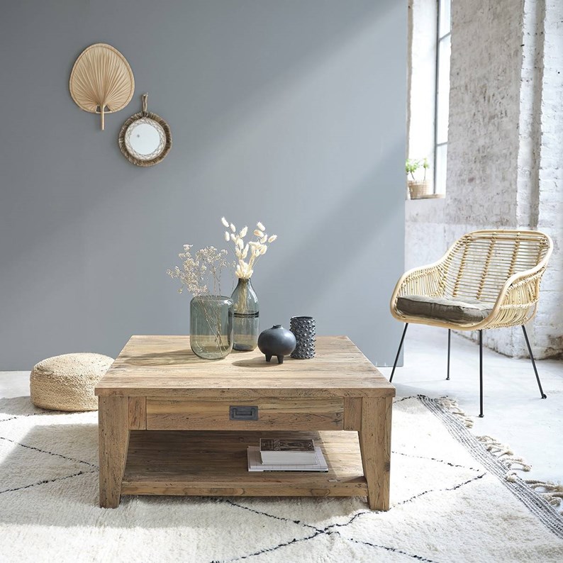 Ce meuble en teck recyclé est fabriquée à la main, de façon artisanale pour faire de chaque meuble une pièce unique, pour votre intérieur. Avec ses 100 cm, sa forme carrée et son tiroir, cette table basse en teck recyclé est idéale pour votre intérieur. Caractéristiques : Matière : Teck recyclé - Couleur : Naturel - Hauteur : 42 cm - Longueur : 100 cm - Largeur : 100 cm - Poids : 54 kg - Garantie : 5 ans - Montage : Livrée montée. Les + : Forme carrée – 1 tiroir.