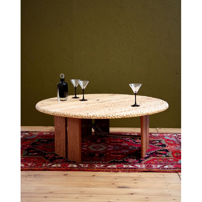 Sublimez votre salon avec cette table basse ronde restaurée, alliant un plateau en bois au grain chaleureux et des pieds métalliques texturés. Son format généreux et sa faible hauteur en font un centre convivial, idéal pour accueillir livres, plateaux et apéritifs lors de moments partagés. Le plateau gougé apporte une touche artisanale et tactile, tandis que le contrevent en métal affirme une esthétique moderne, contrastée et raffinée.
