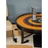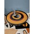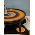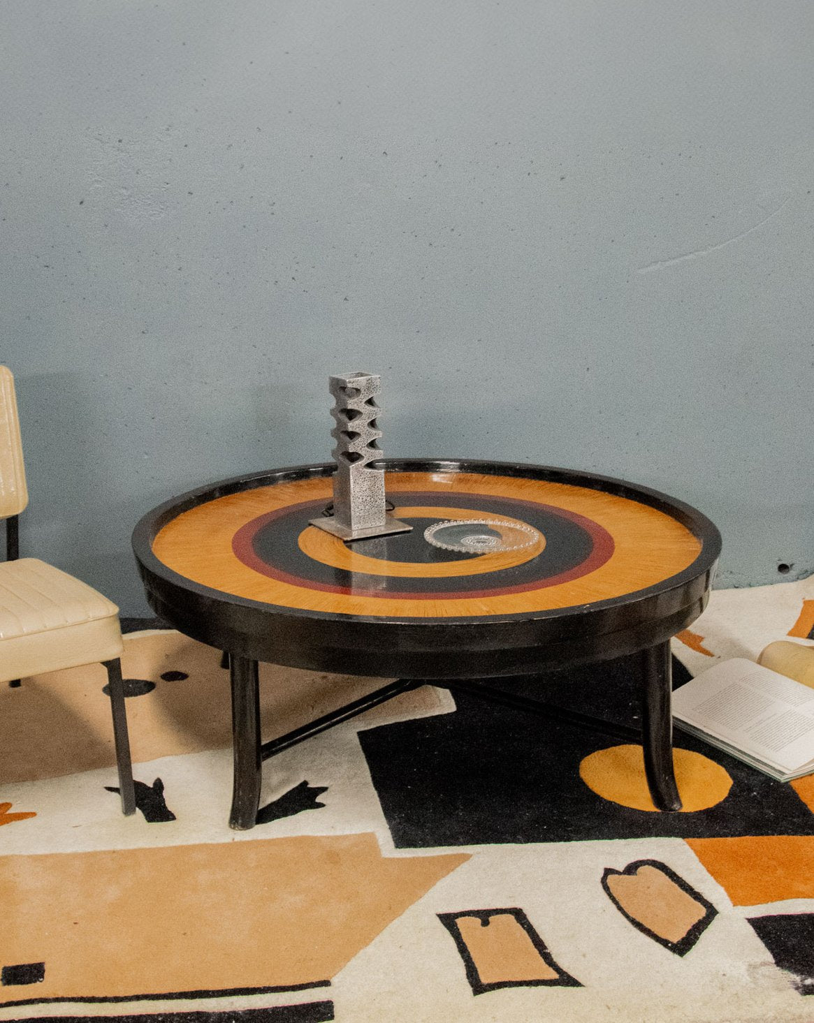 Invitez chez vous cette table basse japonisante marquettée, où trois essences — bois noir, brun et clair — dessinent des cercles concentriques qui captent le regard. Son plateau généreux et sa faible hauteur en font un meuble central pour le salon, idéal pour le service du thé ou pour présenter livres et objets. Les pieds légèrement incurvés soulignent son élégance discrète et apportent une touche artisanale à une atmosphère sereine et contemporaine. Quelques petites rayures et éclats sur le plateau.