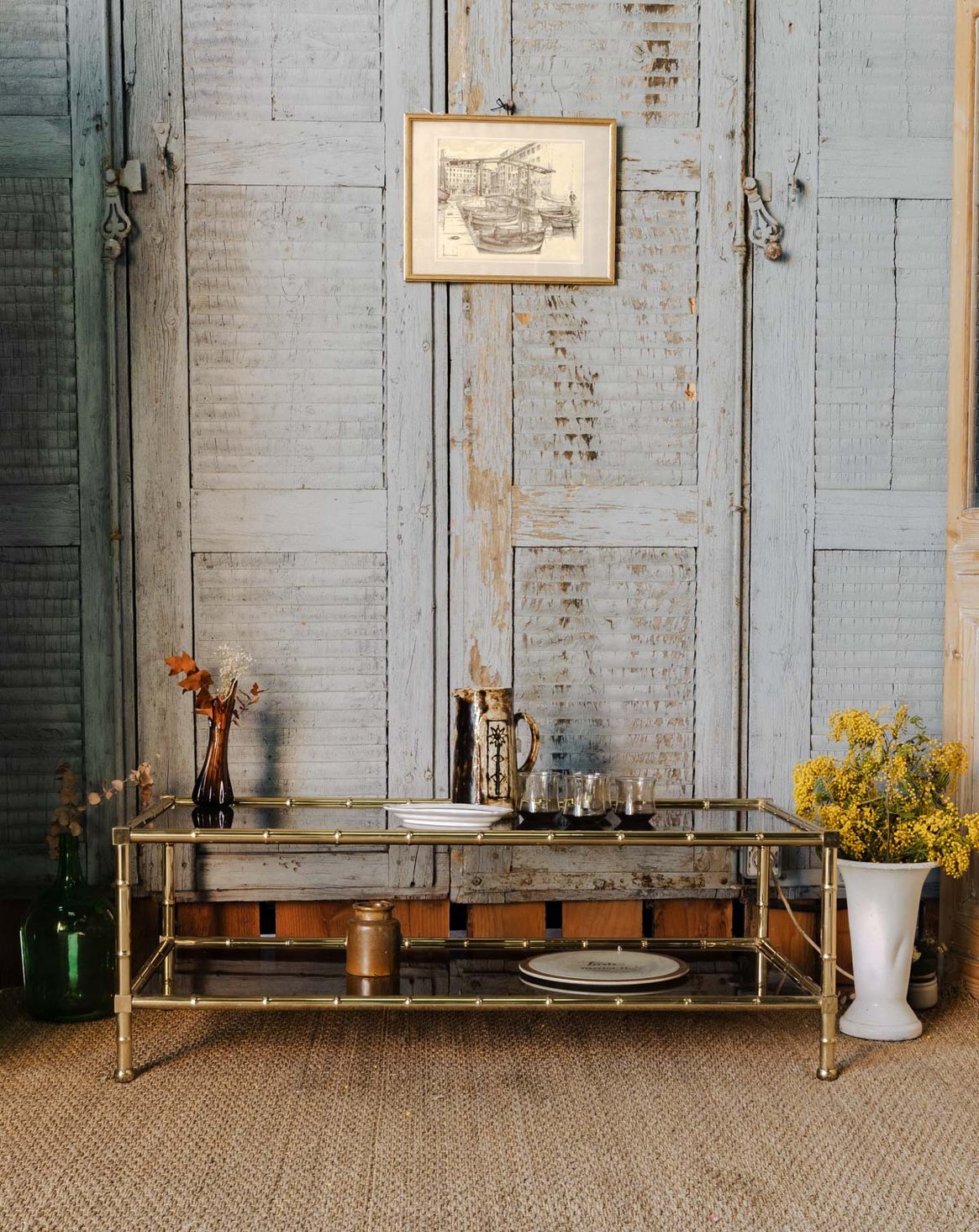 Sublimez votre salon avec cette table basse en laiton doré aux lignes et proportions qui installent une présence élégante sans alourdir l'espace. Son plateau et son sous-plateau en verre fumé offrent deux surfaces pratiques pour présenter livres, objets et lampes, créant des jeux de lumière feutrés. Le mariage du métal doré et du verre apporte une ambiance raffinée et contemporaine, idéale pour un coin conversation ou un intérieur sophistiqué. Quelques traces du temps présentes.
