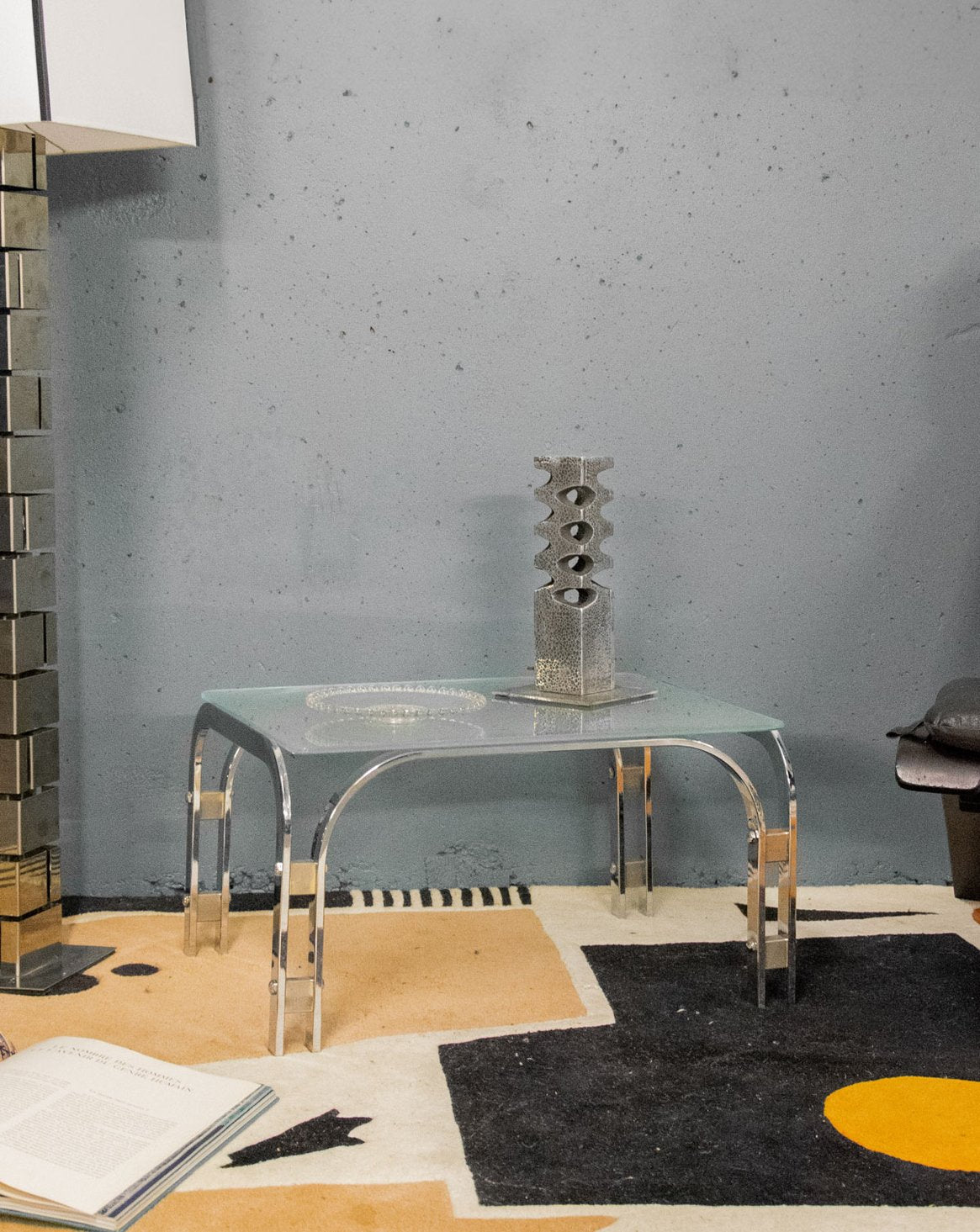 Découvrez cette table basse rectangulaire italienne des années 1970, au piétement métallique chromé qui dessine une élégante silhouette courbée. Son plateau en verre givré diffuse la lumière et équilibre la structure, offrant un point d'appui discret pour livres, objets et plantes tout en ménageant l'espace grâce à ses proportions mesurées. Idéale pour un salon contemporain ou un intérieur résolument graphique, elle apporte une touche de sophistication discrète et une belle sensation d'aération. Quelques rayures discrètes sur le plateau et traces sur le chrome.