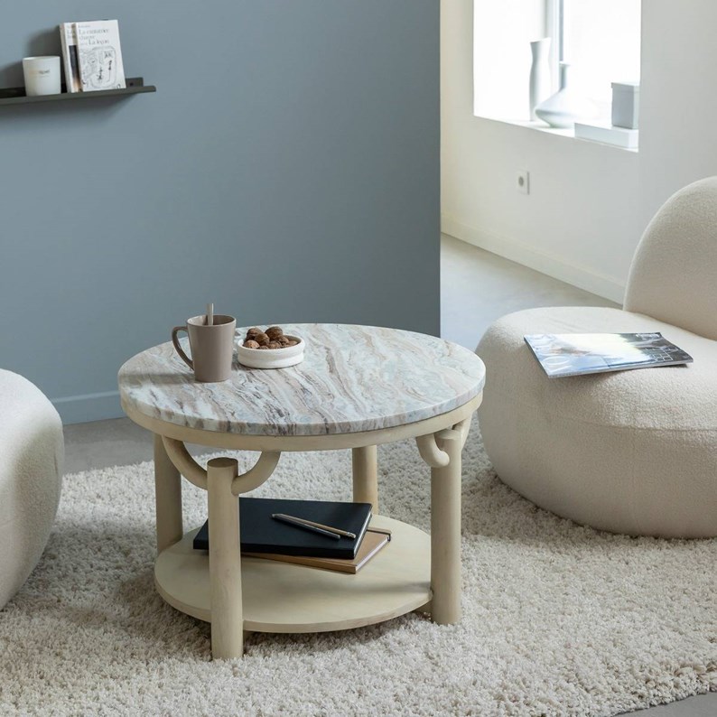 Table basse avec pieds en manguier massif et plateau en marbre – collection Isabella. Une combinaison élégante de matières naturelles pour un salon raffiné et chaleureux. Plateau solide et facile d'entretien.