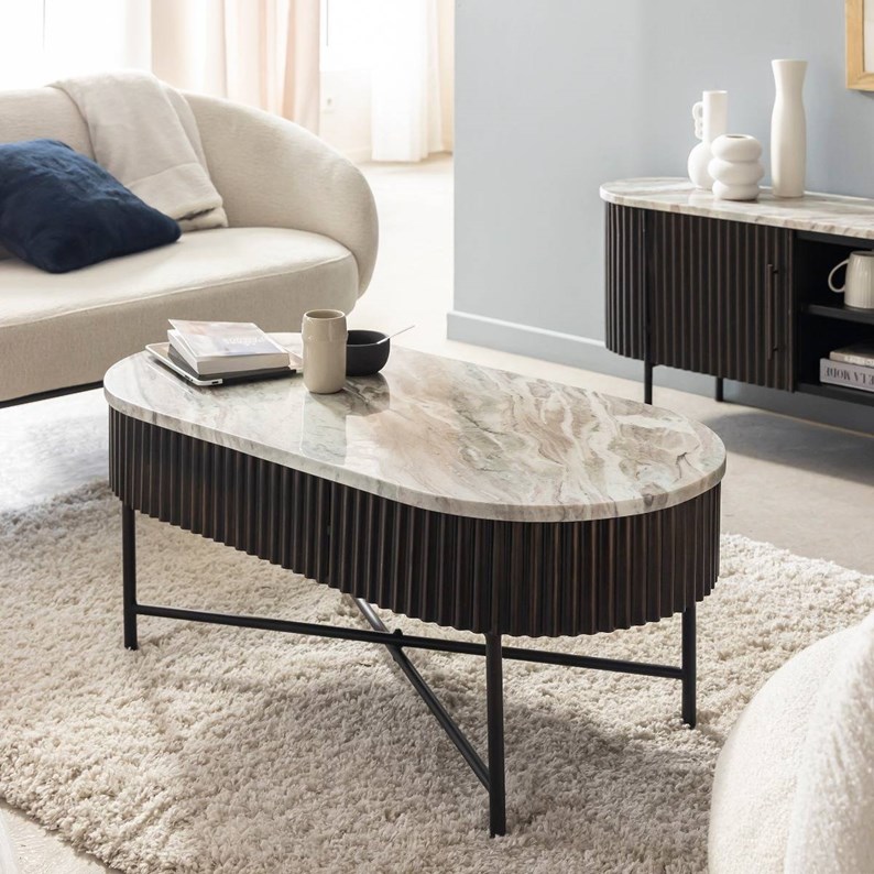 Table basse Orlando en métal aux reflets bronze, avec un plateau en marbre chaleureux et élégant. Une pièce design et pratique pour sublimer votre salon.