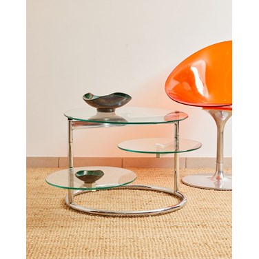 Apportez une table basse à trois plateaux en verre posés sur une structure en métal chromé, alliant transparence et élégance graphique. Les plateaux superposés mobiles multiplient les niveaux d'usage pour présenter livres, lampes et objets déco sans alourdir l'espace, tandis que l'acier chromé souligne une silhouette moderne et lumineuse. Idéale pour un salon contemporain ou un coin lecture, elle crée une ambiance aérienne et structurée, favorisant la circulation visuelle et la mise en scène des objets.