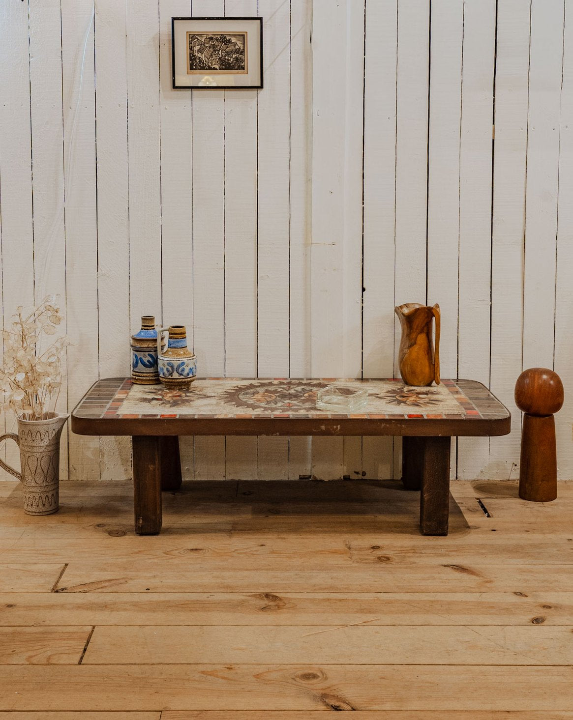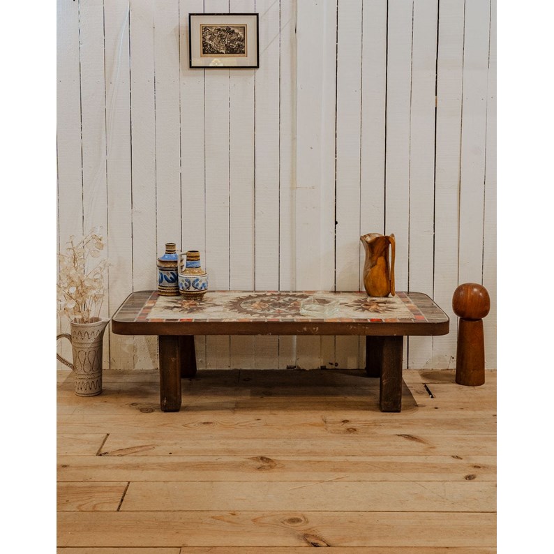 Sublimez votre salon avec cette table basse en céramique marron, dont le plateau en mosaïque aux tons orange et rouge dessine un soleil et une lune. Signée Max et Dominique Picard et datée des années 70, elle affirme un style vintage et artisanal, proposant un plateau généreux pour livres et objets décoratifs. Sa présence apporte une atmosphère chaleureuse, graphique et légèrement méditerranéenne, idéale pour animer un intérieur élégant.