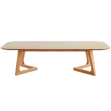 Pour un intérieur aussi cosy que trendy, on accompagne cette grande table basse en bois d'un canapé épuré, d'un pouf effet laine bouclée, et d'un fauteuil design branché !