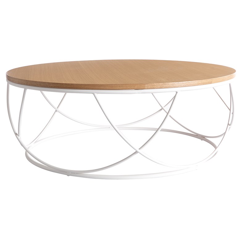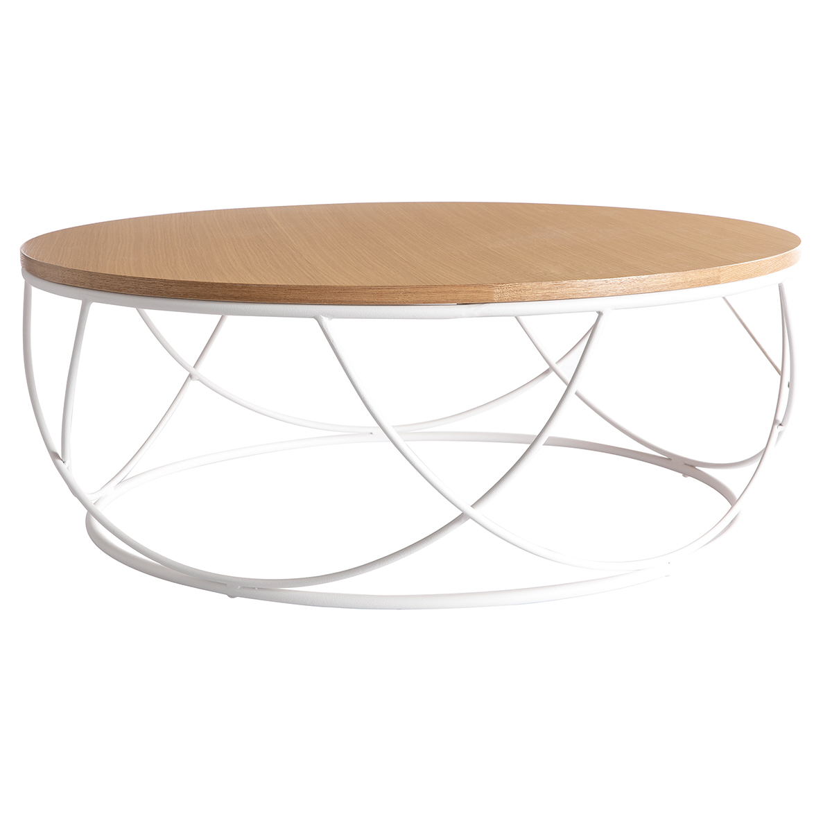 Alliance réussie d'un plateau en fibres de bois placage chêne et d'une base ajourée faite d' arceaux métalliques , ce modèle de table basse en bois clair et métal blanc apportera un charme fou à votre intérieur ! Voilà une grande table basse ronde sans pieds (L80 x L80 x H30 cm) qui mixe modernité des lignes et inspiration scandinave !