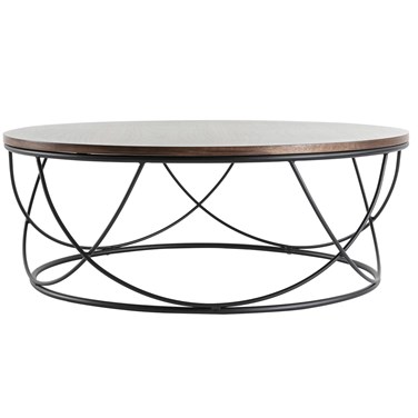 Alliance réussie d'un plateau en fibres de bois placage noyer et d'une base ajourée faite d' arceaux métalliques , ce modèle de table basse en bois foncé et métal noir apportera un charme fou à votre intérieur ! Voilà une grande table basse ronde sans pieds (L80 x L80 x H30 cm) qui mixe modernité des lignes et look industriel !