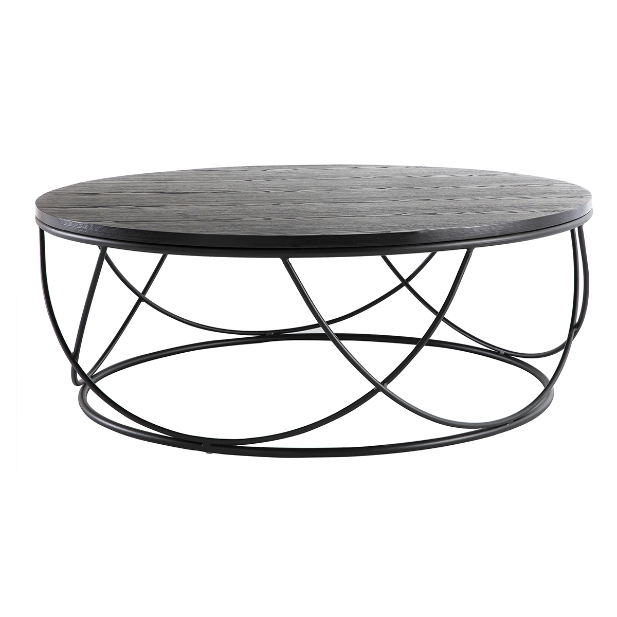 Alliance réussie d'un plateau en fibres de bois placage frêne teinté noir et d'une base ajourée faite d' arceaux métalliques , ce modèle de table basse en bois teinté noir et métal noir apportera un charme fou à votre intérieur ! Voilà une grande table basse ronde noire sans pieds (L80 x L80 x H30 cm) qui mixe modernité des lignes et look industriel !