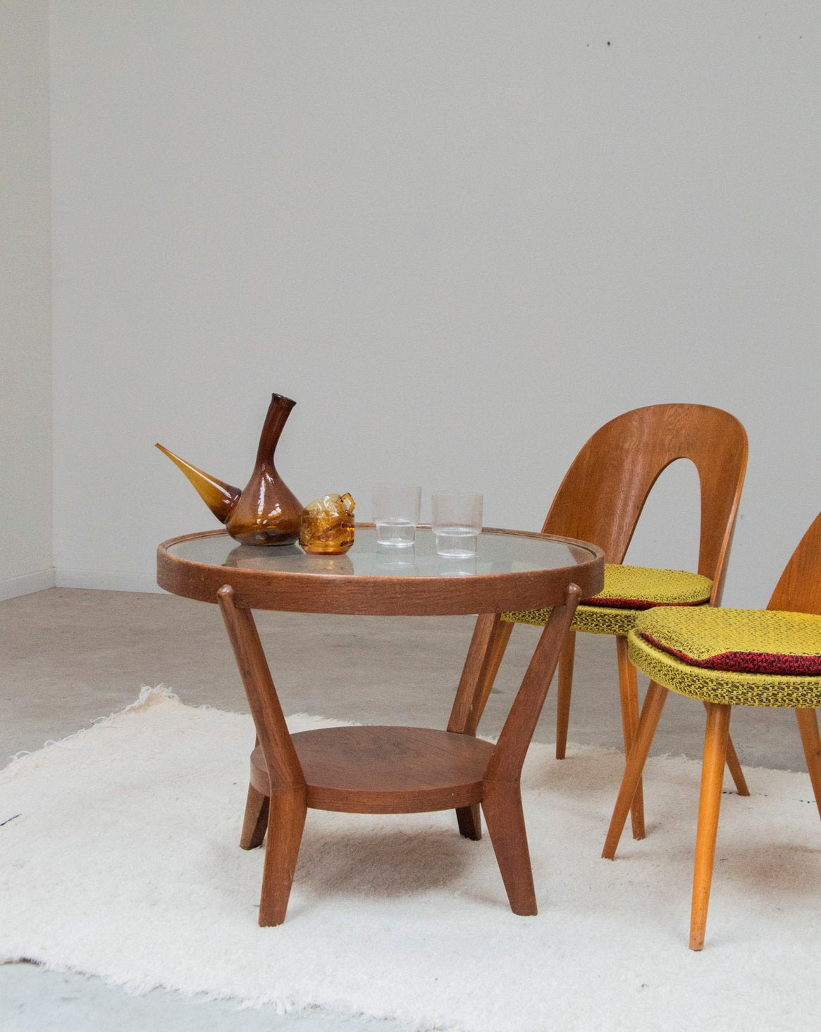 Adoptez cette table ronde au plateau en verre transparent et à l'étagère inférieure en bois clair, une pièce qui marie légèreté et chaleur. Son plateau vitré laisse passer la lumière tandis que l'étagère basse offre un rangement discret pour livres et objets, idéale pour un salon ou un coin lecture. Les quatre pieds finement travaillés assurent stabilité et élégance, soulignant des proportions compactes et accueillantes. Ambiance contemporaine et tactile qui invite à la convivialité. Traces d'usures légères.