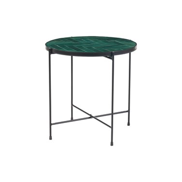Rappel de l'indémodable motif chevron, les carreaux de céramique verte - disposés en quinconce - apportent une touche graphique qui dynamise le plateau rond (D50 x E2 cm). L'ensemble est soutenu par un piètement filaire et aérien en métal noir d'une élégante simplicité.