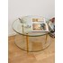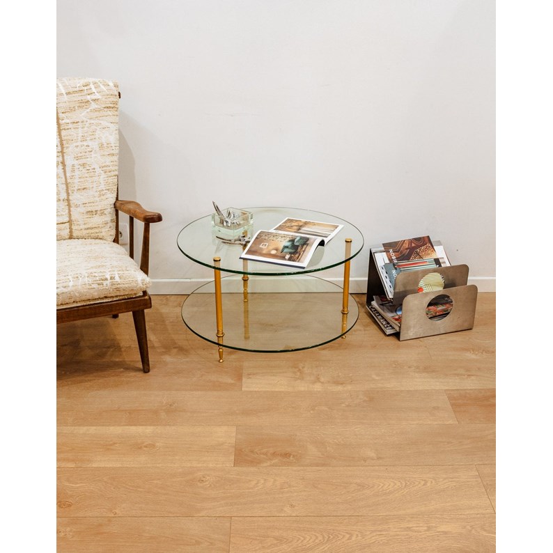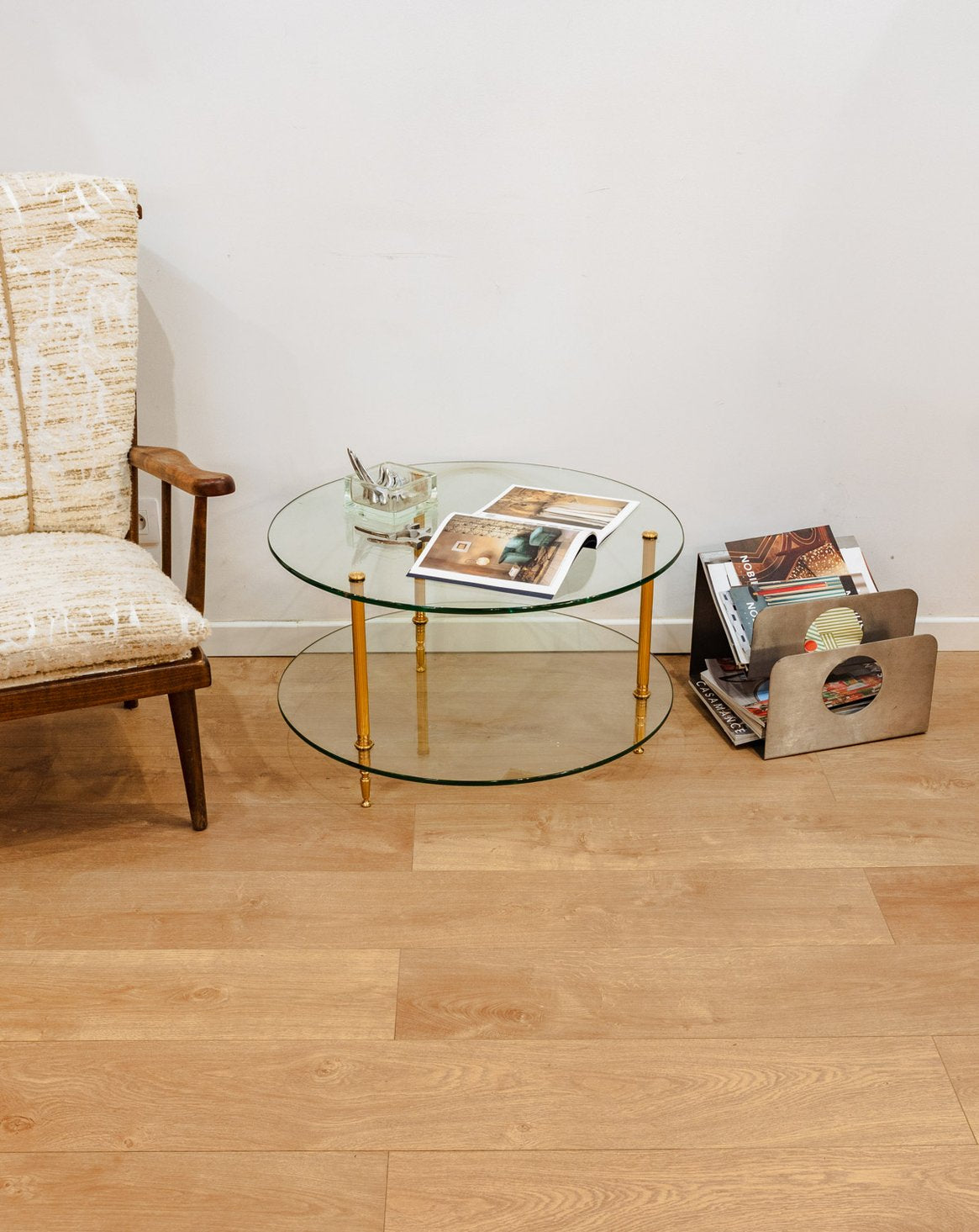 Sublimez votre salon avec cette table basse ronde en verre, dotée de deux plateaux qui conjuguent fonctionnalité et élégance. Le jeu de transparences met en valeur les objets déposés tandis que le piètement doré apporte une note chaleureuse et raffinée, contrastant avec la légèreté du verre. Son format s'intègre facilement devant un canapé pour poser livres et tasses ou créer un coin cosy et lumineux. Quelques traces du temps présentes.