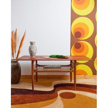 Sublimez votre salon avec cette table basse scandinave signée Kofod Larsen, création des années 60 au design épuré et intemporel. Son grand plateau propose un espace généreux pour poser livres et objets, tandis que le porte-revues intégré conserve magazines et plaids à portée de main. Réalisée dans un bois chaleureux et finement travaillé, elle incarne le style mid-century, sobre et fonctionnel, idéale comme pièce centrale d'un intérieur contemporain ou rétro. Pièce unique en très bon état.