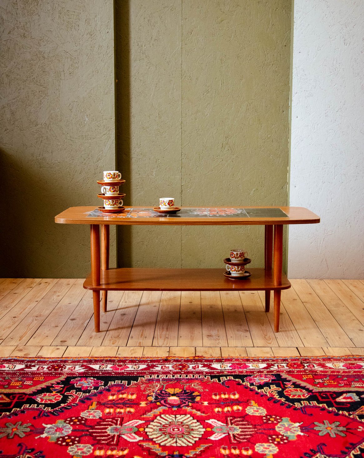 Sublimez votre salon avec cette table basse scandinave des années 60 en teck, qui marie la patine chaude du bois à un plateau en carreaux de céramique émaillé au décor fleuri. Ses pieds fuseaux et sa tablette inférieure offrent des proportions équilibrées et un rangement discret pour livres ou objets, idéale dans un espace de taille moyenne. Son allure sobre apporte une note rétro, poétique et chaleureuse à votre intérieur.
