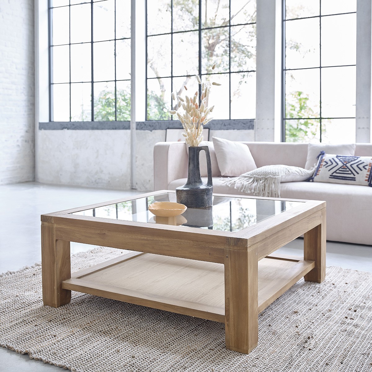 Fonctionnelle et moderne, cette table basse carrée en bois de teck brut dispose d'un plateau supérieur en verre. Un look élégant et authentique qu'on adore dans un salon. Caractéristiques : Matière : Teck brut de Qualité Premium - Couleur : Naturel - Hauteur : 40 cm - Longueur : 100 cm - Largeur : 100 cm - Poids : 39 kg - Garantie : 5 ans - Type de verre : classique. Epaisseur du verre : 6 mm - Montage : Livrée montée. Les + : Plateau en verre – Teck brut - Double plateau - Format carré.