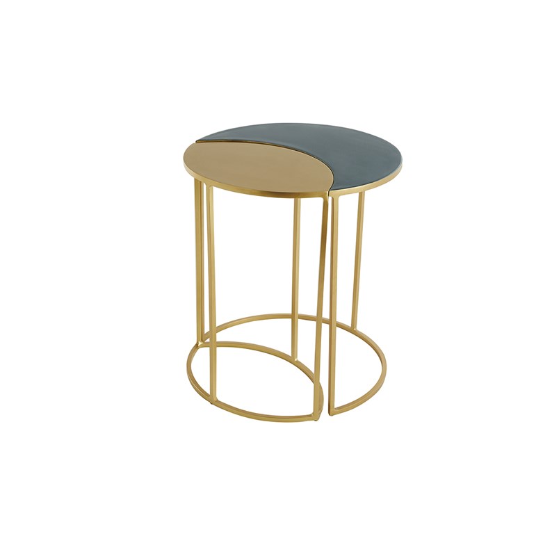 La fine structure en métal doré dessine de jolies lignes graphiques dans l'espace. Elle s'équilibre brillamment avec les plateaux (épaisseur 1 cm) en métal doré et métal laqué bleu pétrole . En résulte une silhouette singulière et délicate qui s'intègre facilement dans tous les intérieurs.